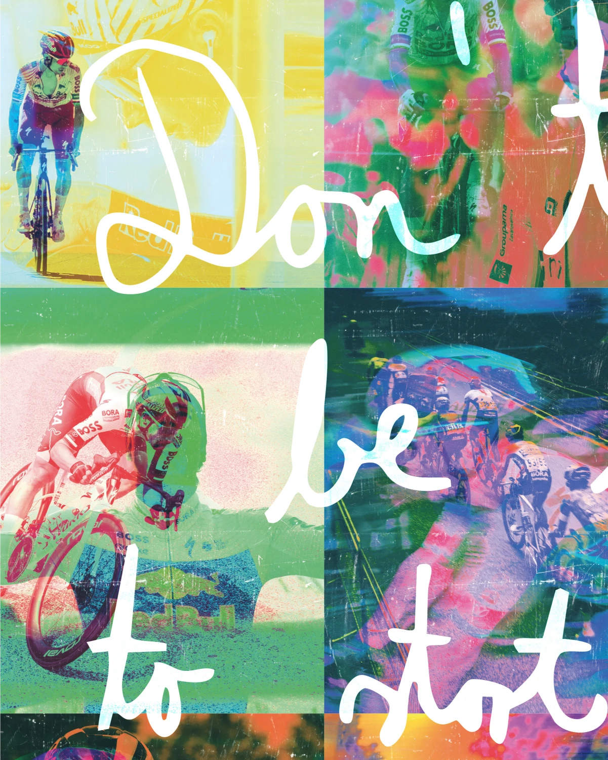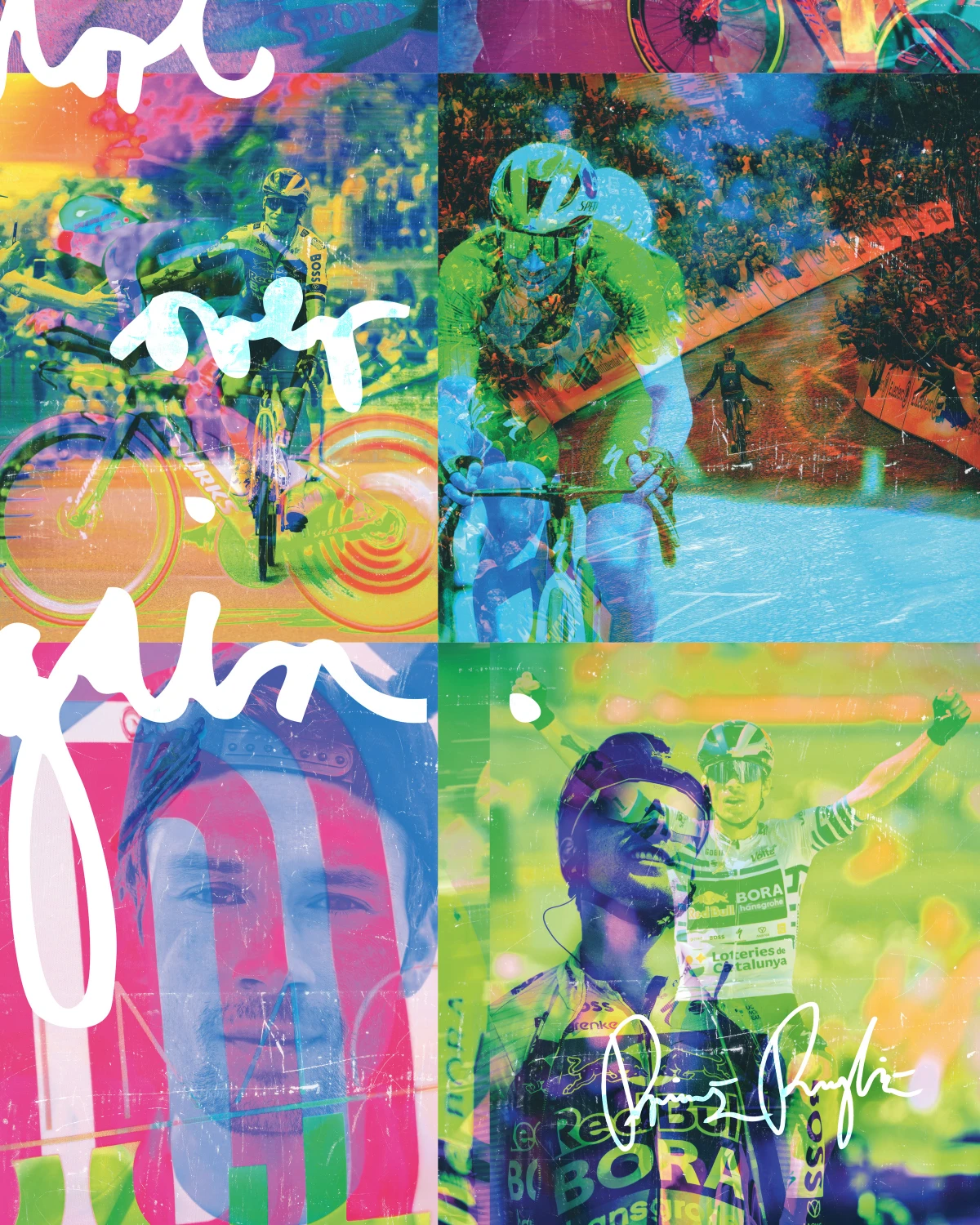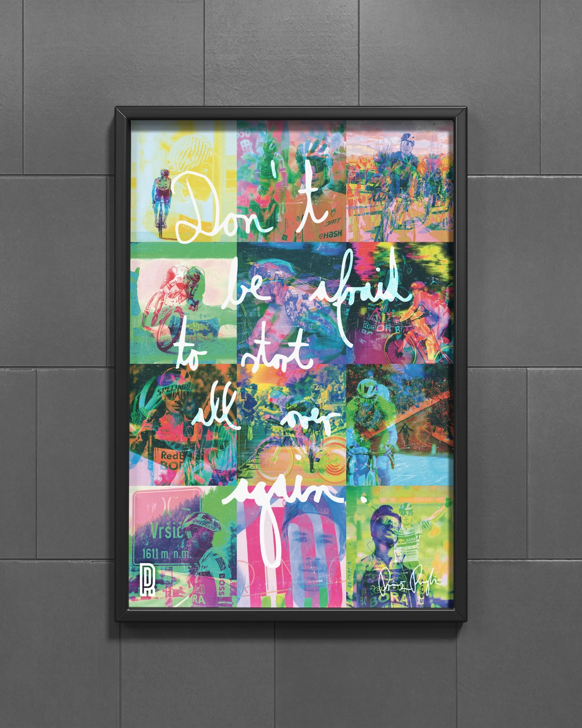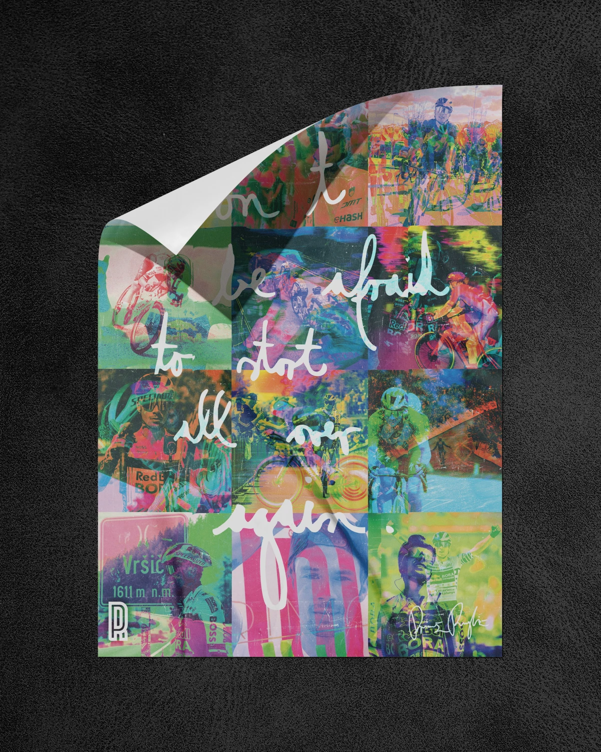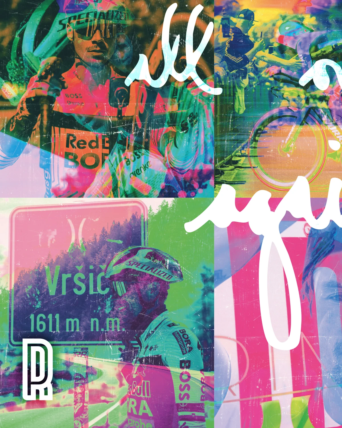 It features the same photographs and collage motifs as the 2026 calendar of Fundacija Primoža Rogliča, bringing the story into a format that stands on its own as a poster. The collages combine intense cycling moments with the energy of Primož Roglič’s handwriting and thoughts, alongside expressive colors that go beyond documentary style to create a powerful visual impact. The poster is not tied to a specific time or month, but carries a universal message of perseverance, inner strength, and the constant drive to push limits.