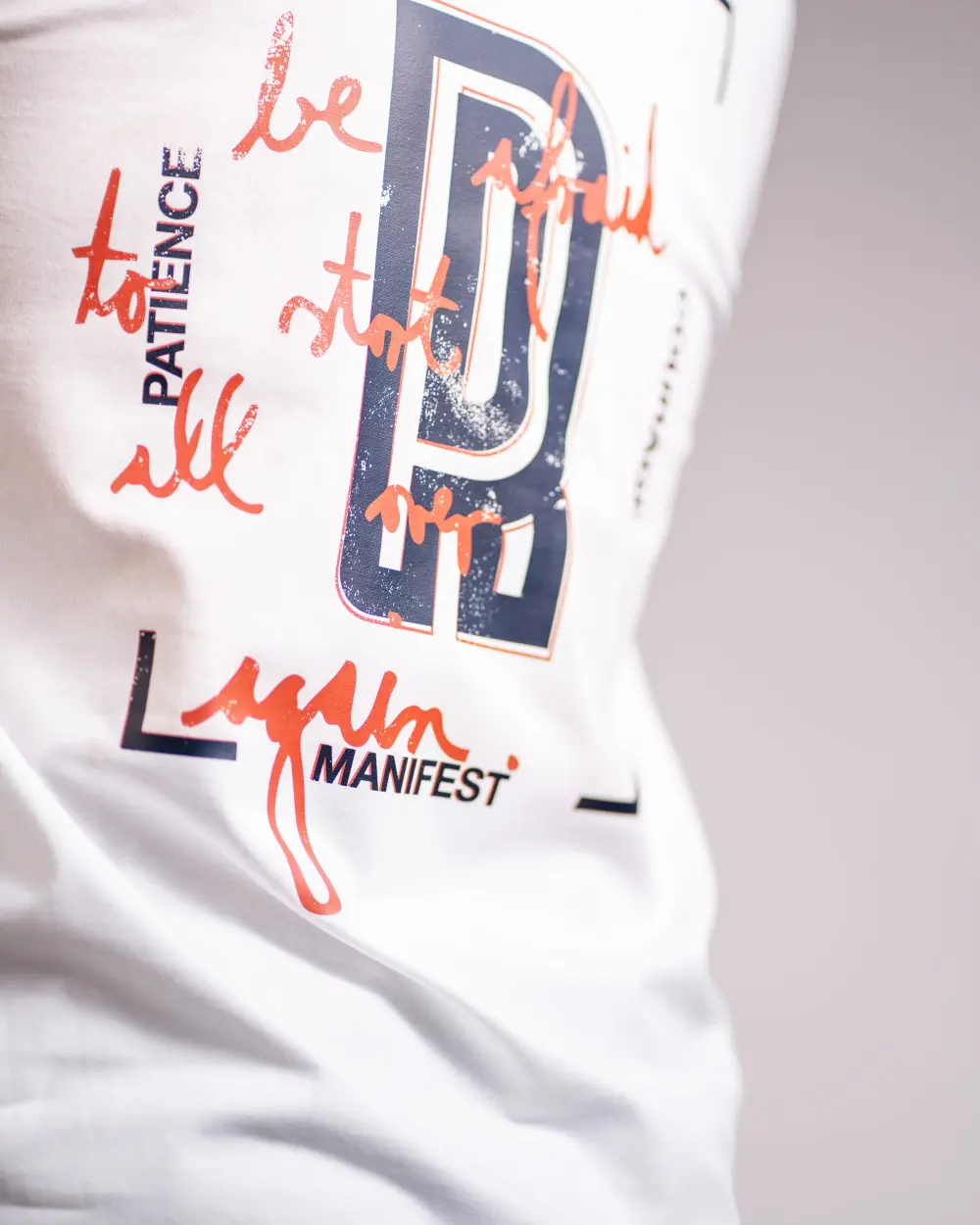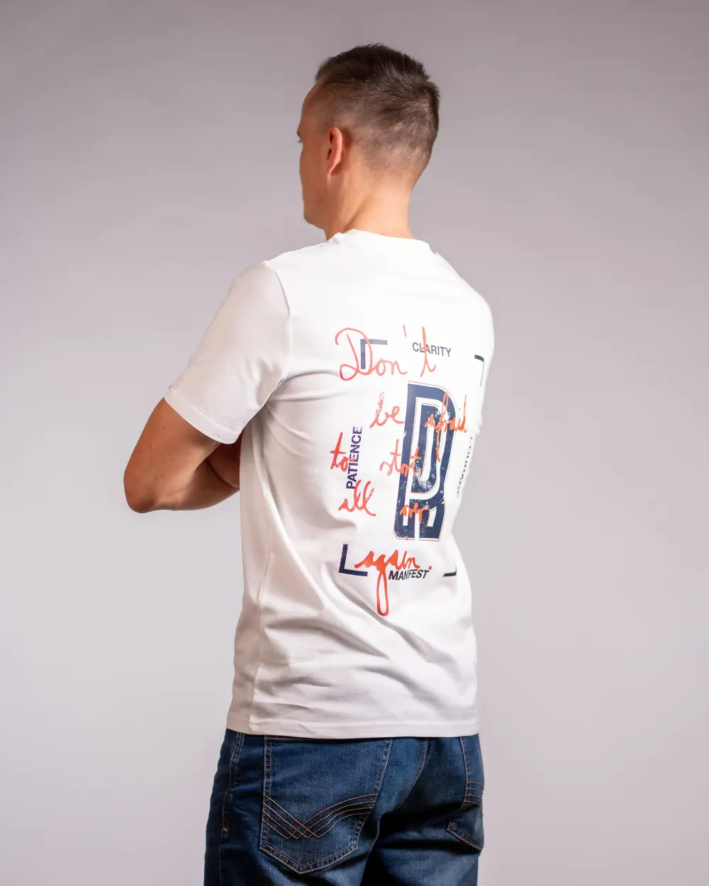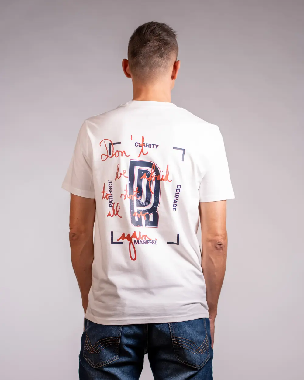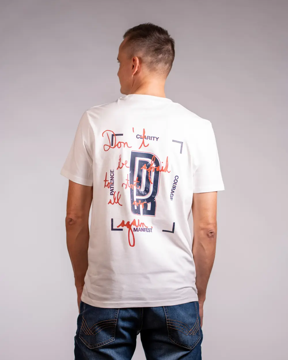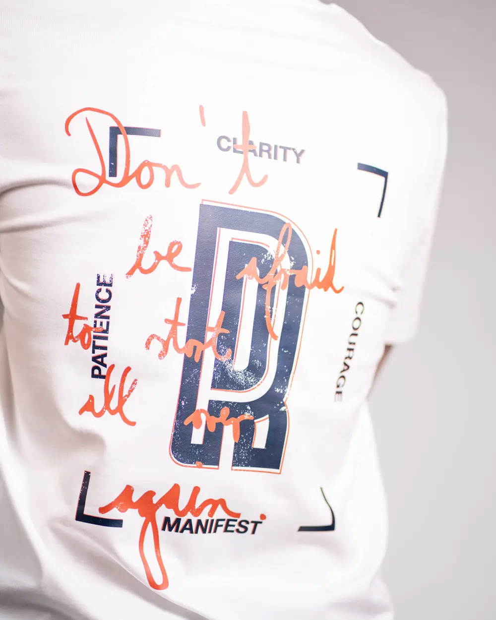Patience. Clarity. Courage. Manifest. A bold graphic statement inside a square. Everything you need to break the frame. Don’t Be Afraid to Start All Over Again.
