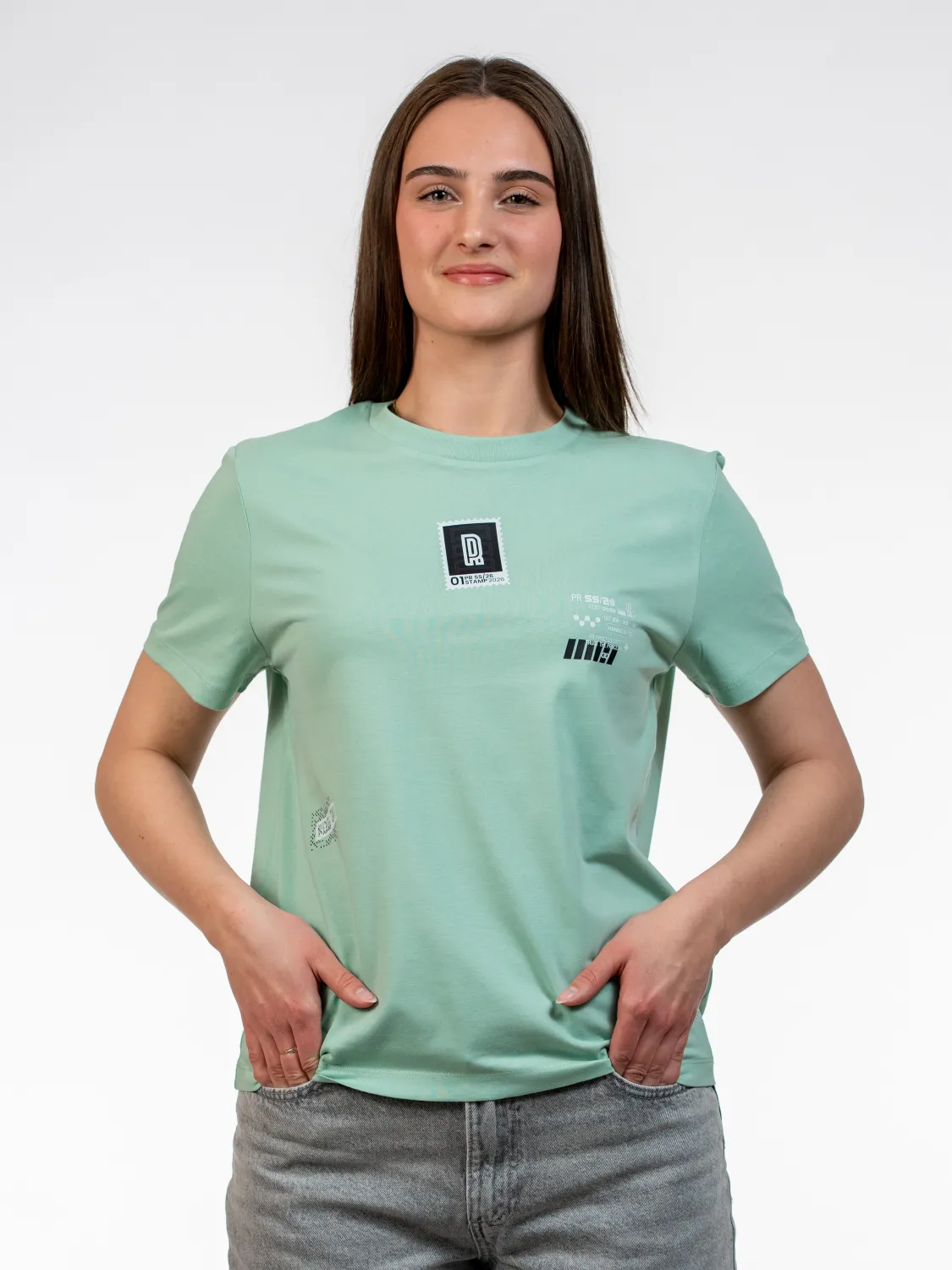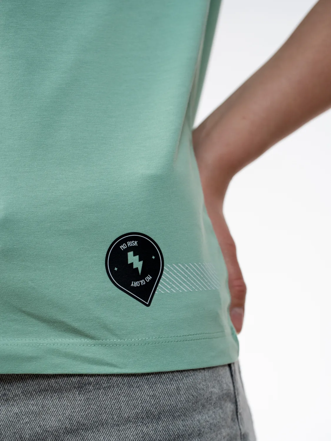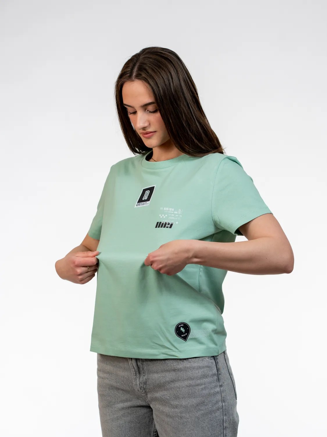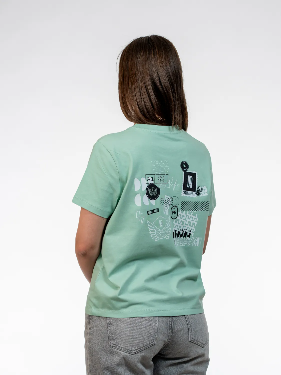 Sticker grafika združuje različne elemente v kompozicijo. Misty Jade barva poudari čist videz in subtilno estetiko kolekcije. Ustvarjena za vsakdan, ki gradi rezultat.
